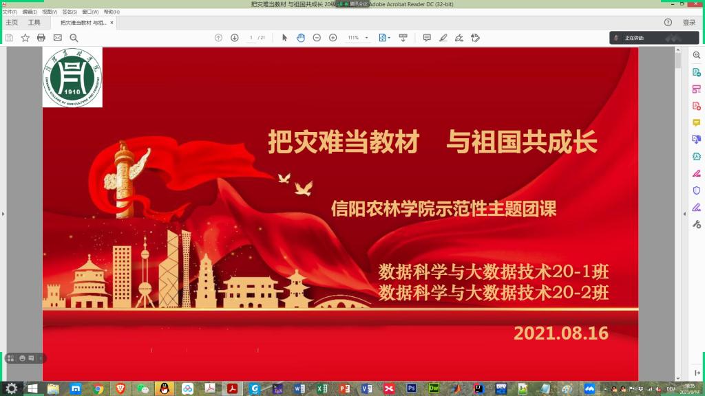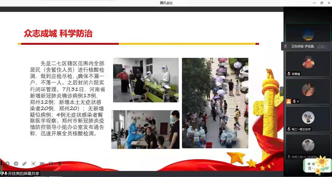 为引导广大团员青年把灾难当教材,与祖国共成长,信息工程学院团总支于8月16日-20日举办了“把灾难当教材,与祖国共成长”线上团日活动,由各班团支书主持,辅导员参与发言。