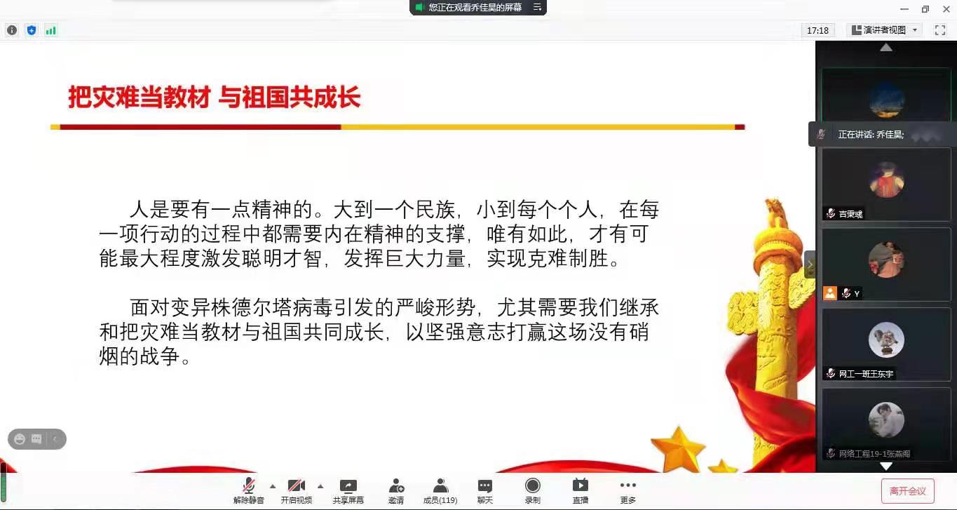 会后,各位同学纷纷表示,要听从地区疫情防控安排,积极参与社区抗疫和防汛救灾工作,把灾难当做人生成长的磨练,在奋斗中展现青春力量!