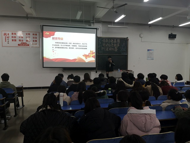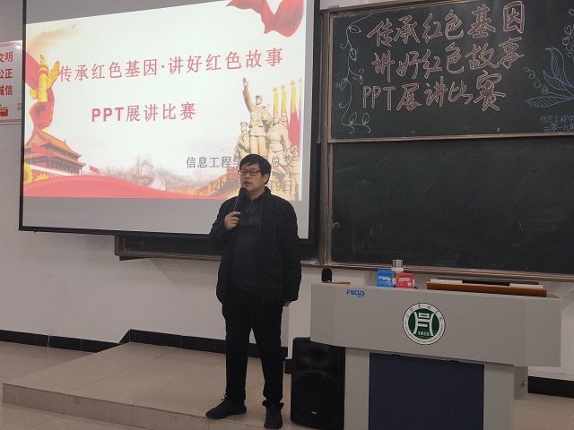 为引导同学们积极学习红色文化,传承红色精神,2019年12月9日19时信息工程学院团总支于一教E201教室举行了主题为“传承红色基因,讲好红色故事”的PPT故事展讲比赛,学院党总支副书记朱猛,辅导员宋东阳、吉秉彧和严舒平作为评委,我院部分学生参加比赛。