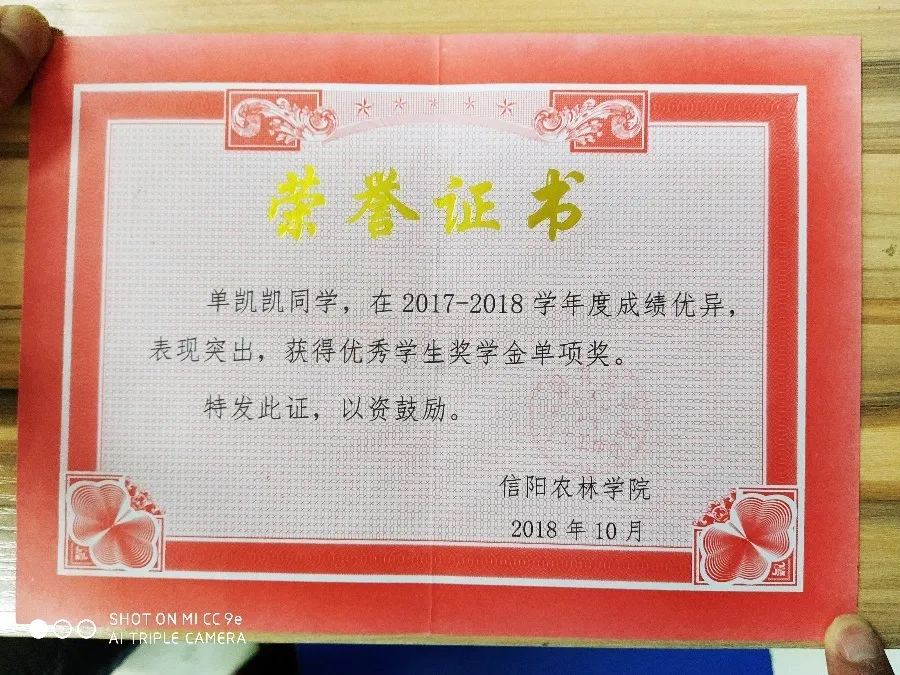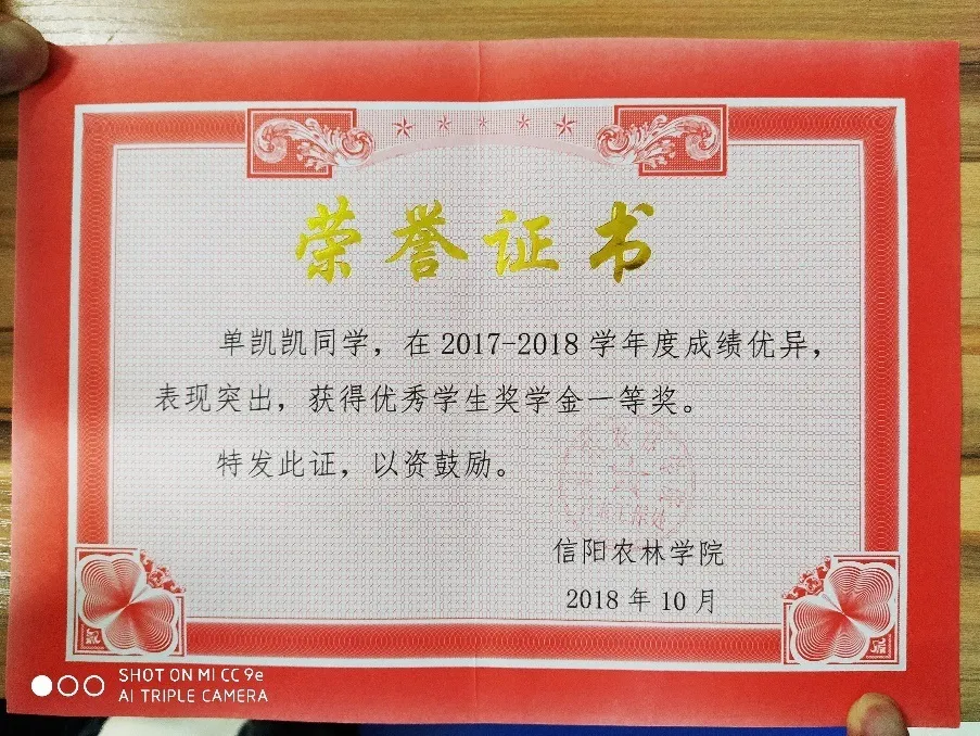 在大学学习期间,单凯凯同学依然保持着高中时早起的习惯,每天清晨5点总能在宿舍楼下看到他早读的身影。在日常学习中,他从不迟到不早退,遇到困惑之处会主动向老师请教。课余时间,他也坚持通过各种方式获取知识,不断夯实专业基础,提高专业技能。功夫不负有心人,他的学习成绩始终在年级名列前茅,并于2018年10月获得国家励志奖学金、校级一等奖学金和单项奖学金。这是对他的努力最好的嘉奖。