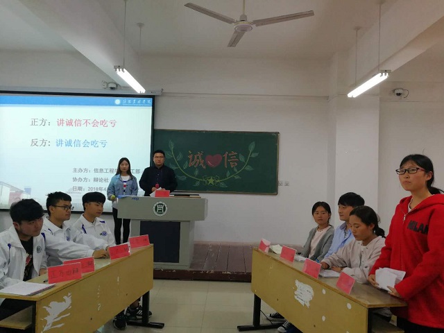 为加强诚信宣传教育,提高大学生的诚信意识,营造诚信和谐的校园环境,4月25日晚,信息工程学院在二教303组织开展了“诚信校园行系列活动——诚信辩论赛”。此次辩论赛以“讲诚信是否会吃亏”为主题,除参赛队员外,王同军等多位辅导员老师也作为评委参与其中,以及数名学生前来观赛。
