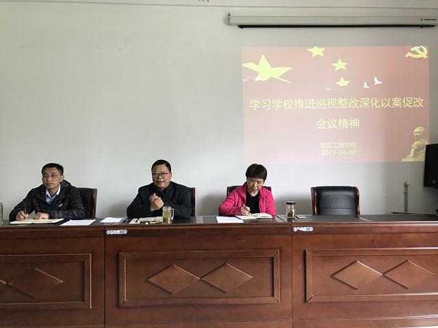 2019年4月30日下午,信息工程学院组织深入学习了学校推进巡视整改、深化以案促改会议精神。学院全体教职工参加,院党总支书记胡凤堂主持。