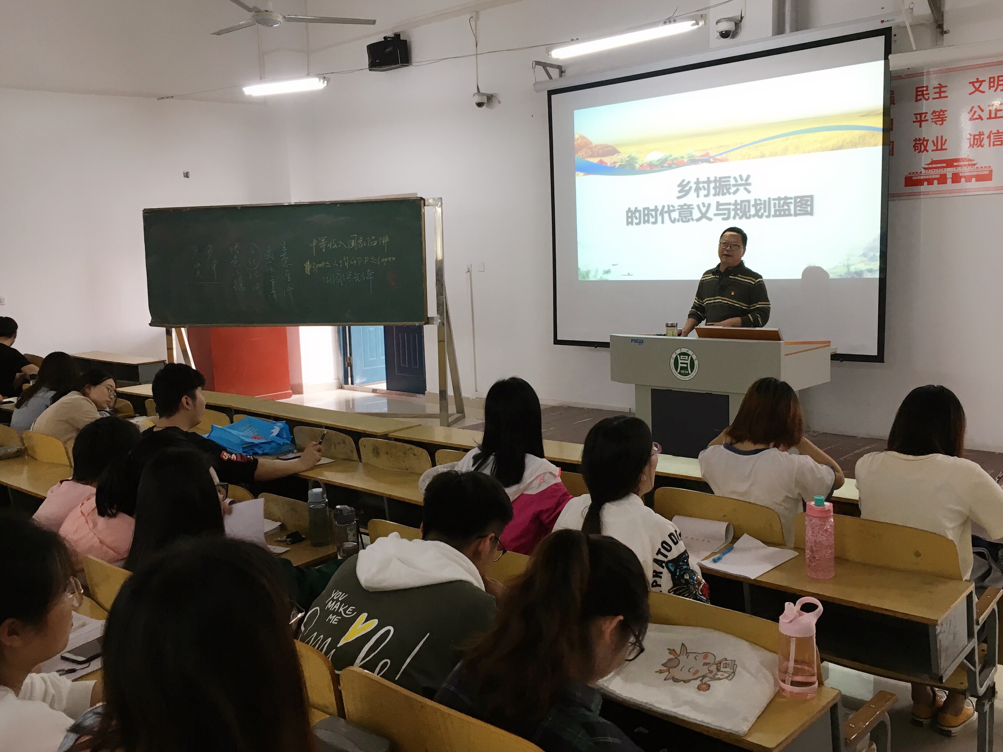 5 月 30 日 下午, 信息工程学院党总支书记胡凤堂 在 2 教 406 教室为 2016 级网络工程、水产养殖专业的学生上了一堂题为《乡村振兴的时代意义与规划蓝图》的形势与政策课。