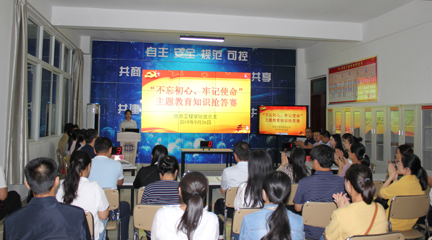 9月26日下午6:30,信息工程学院在科技楼1A404成功举办“不忘初心、牢记使命”主题教育知识大赛,学院党总支和六个教工支部全体党员参加活动。活动由数字媒体技术2018级同学陈思宇主持。