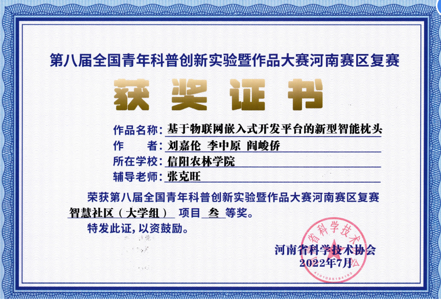6月14日上午,第八届全国青年科普创新实验暨作品大赛(河南赛区)复赛开赛。《基于物联网嵌入式开发平台的新型智慧枕头》最终获得了三等奖。为组织开展好此次科普创新实验大赛,物联网工程教研室高度重视,广泛动员,积极推动。活动中,beat365在线平台官网信息工程学院教师张克旺组成师生团队,精心准备,积极备战,并被评为优秀指导教师。