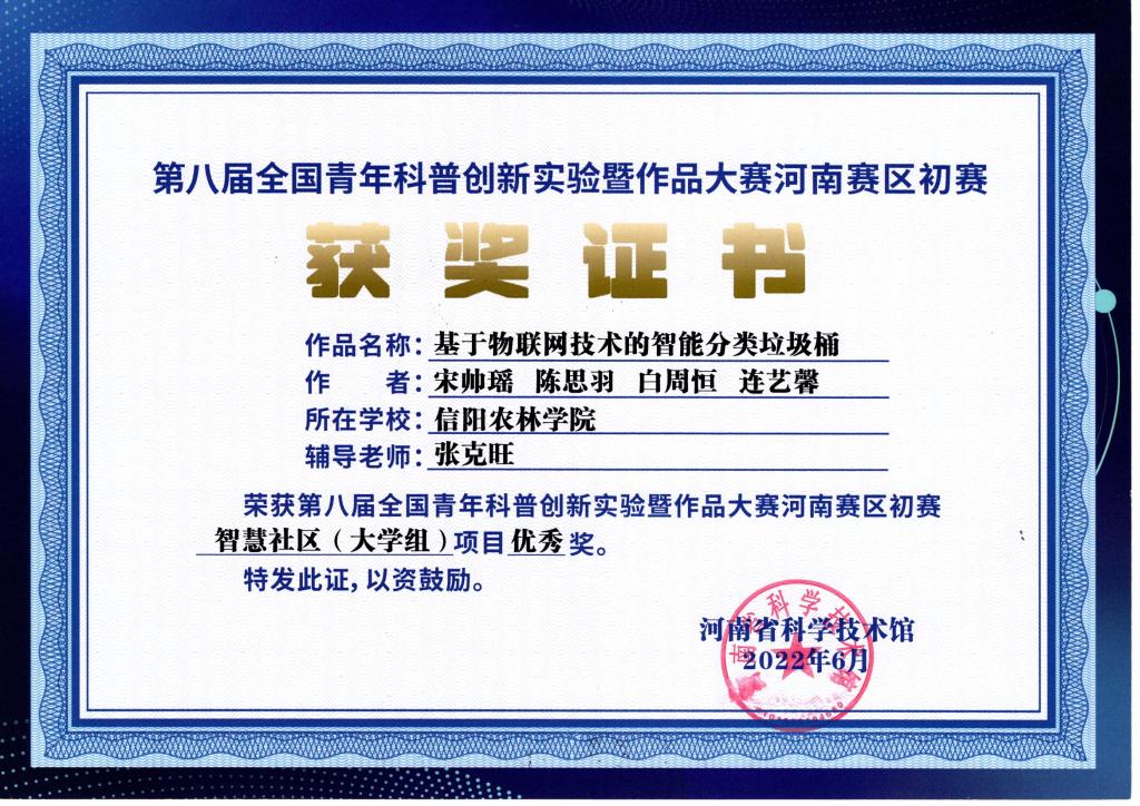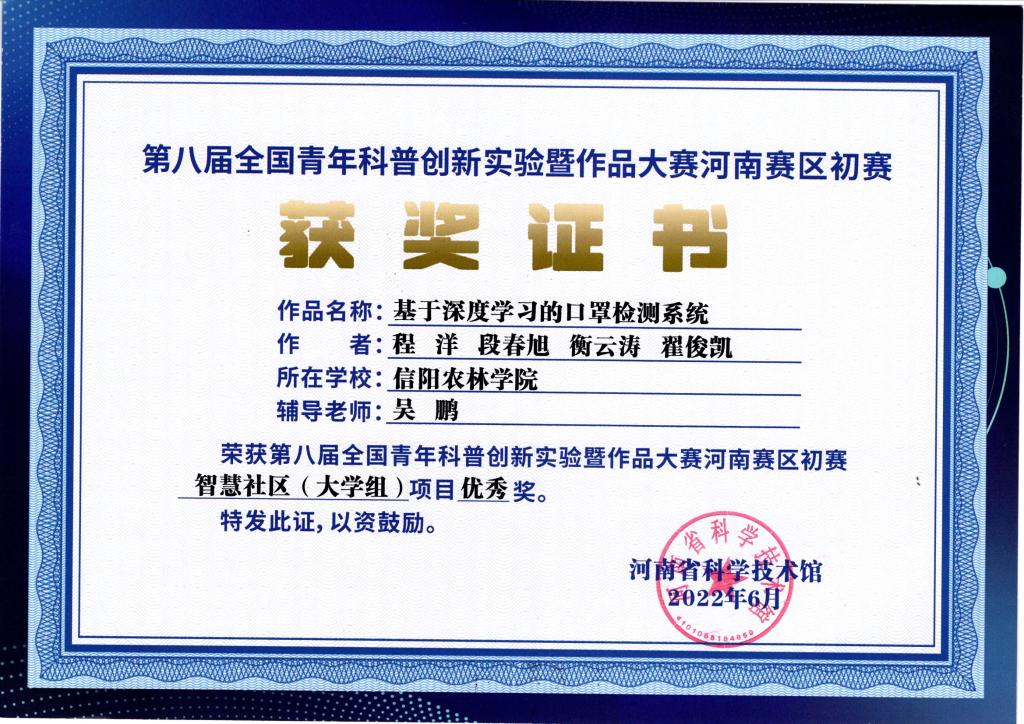 由河南省科学技术协会主办、河南省科学技术馆承办的第八届全国青年科普创新实验暨作品大赛河南赛区评选结果揭晓,beat365在线平台官网物联网工程专业报送的科普作品《基于物联网技术的物联网智能垃圾桶》和《深度学习的口罩检测系统获得优秀奖》在初赛中获得了优秀奖。《基于物联网嵌入式开发平台的新型智慧枕头》进入到复赛。