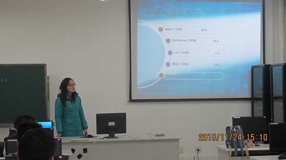 为积极引导毕业生做好相关就业准备,帮助毕业生更深入地了解本专业的就业前景。2015年11月24日下午3点,在1A302实验室,邀请郑州昱睿软件科技有限公司技术部经理崔恒为2016届毕业生做就业指导报告。报告会由院团总支书记朱猛老师主持。