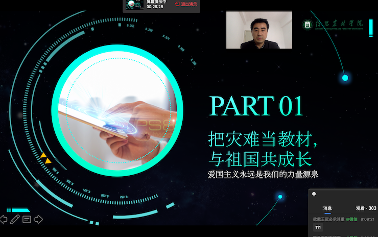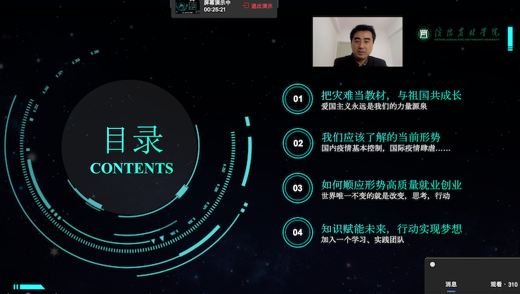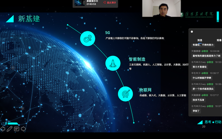整个讲座分为四个部分,分别是:把灾难当教材,与祖国共成长;我们应该了解的当前形势;如何顺应形势高质量就业创业;知识赋能未来,行动成就梦想。开篇,殷老师动情的说到:“爱国主义永远是我们的力量源泉,大家一定要用对祖国对人民最深沉的爱来指引我们的就业创业方向”。接着,殷老师指导大家在电商、软件系统开发、产品三维展示和营销、新基建中寻找就业机会,鼓励大家在危机中好好学习增强内功,抓住机遇转危为机。他还全面讲解了智能制造、5G、工业4.0、物联网、人工智能、大数据、云计算、虚拟现实等当下热门就业领域,引导大家在这些领域选择一个就业方向,学习相关知识,成为技术大拿,实现就业创业。最后,他还希望大家保持积极的就业心态,先就业再择业,通过不断学习专业知识,提升自身能力,进而最大限度的实现自己的人生价值。