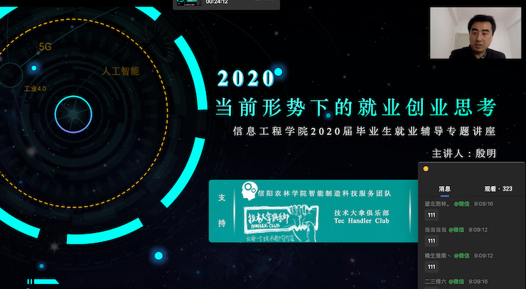 信息工程学院高度重视毕业生就业工作,为了积极应对疫情对2020届毕业生就业造成的不利影响,学院因势施策,充分利用网络优势为毕业生提供就业创业指导服务,精心策划了指导毕业生就业的系列专题讲座。4月18日上午9点,由殷明老师主讲的“当前形势下的就业创业思考”专题讲座通过网络直播的方式开讲。学院师生三百多人通过网络参与了这次讲座。此次讲座由学校智能制造科技服务团队和学院技术大拿俱乐部提供支持。
