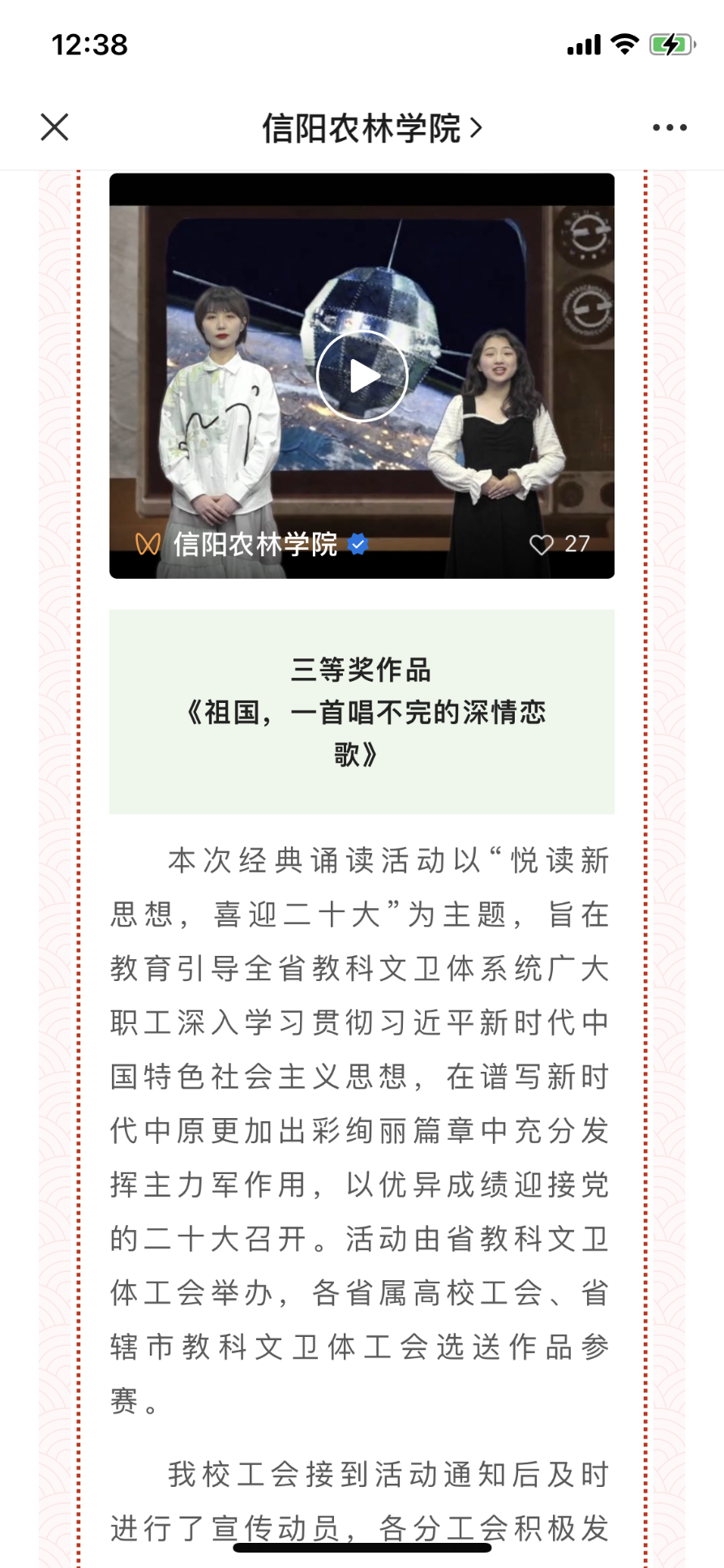 分工会举行“喜迎二十大,奋进新征程”为主题的摄影比赛,教师们积极参加,参赛作品各有千秋,以农林学院风景、信阳的民俗风情、乡村旅游等为创作题材作品,展示了自己摄影技术和人生理念。其中朱猛老师和殷明老师的作品选送学校,在学校活动中展出。