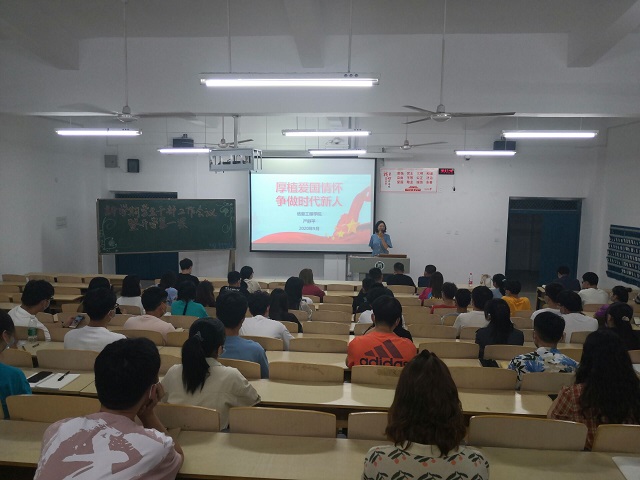 为进一步加强大学生爱国主义教育,弘扬爱国主义精神,培养广大青年的历史责任感及使命感,2020年9月6日晚,信息工程学院团总支书记严舒平在二教206教室以“厚植爱国主义情怀,争做时代新人”为题,为院全体学生干部讲授了“开学第一课”。院党总支副书记朱猛、18、19级辅导员及主要学生干部参会。