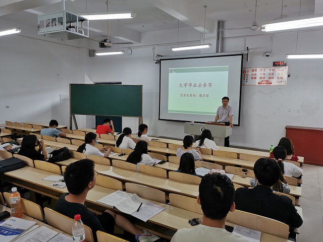 为了深入普及国防知识,强化国防意识,激励大学生征兵入伍,积极投身国防事业,2020年7月3日,信息工程学院邀请了党委武装部副部长兼学生处副处长魏宗烽为2020届专科毕业生做了一场国防教育及征兵入伍报告会。
