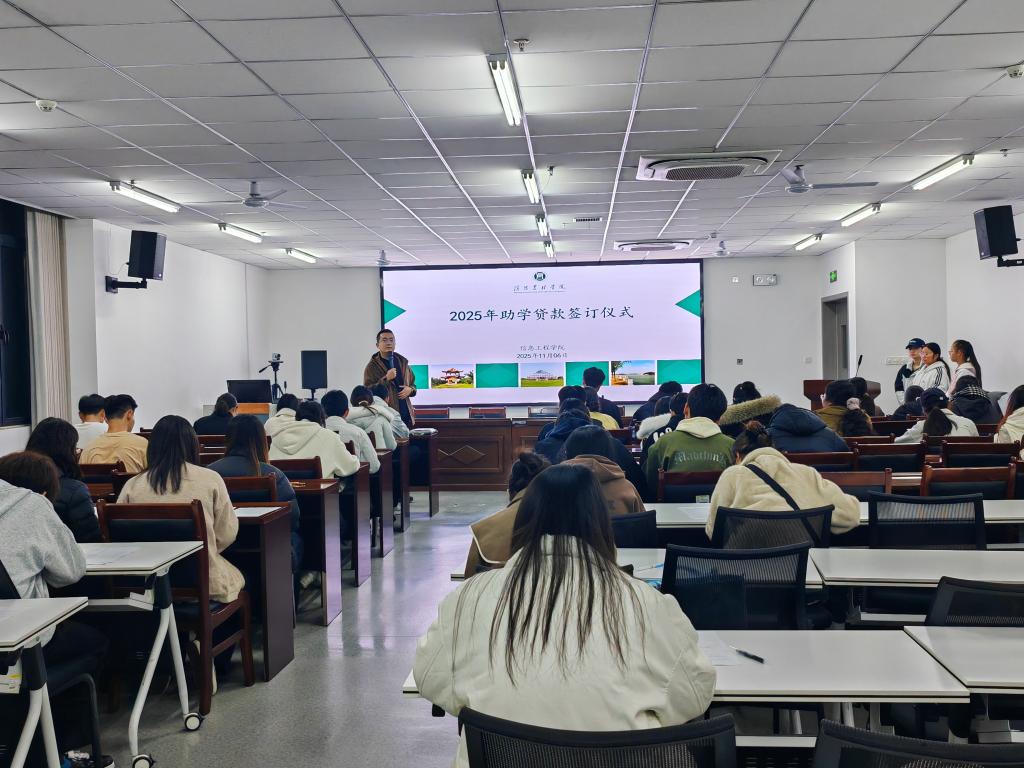 为全面落实2025年度高校助学贷款相关工作,切实减轻学生的学业经济负担,同时强化贷款学生的诚信贷款意识和履约观念,信息工程学院于11月6日晚在双创中心楼703会议室,举办了2025年助学贷款签订仪式。仪式由学院资助专员谭翔升主持,全体申请高校助学贷款的学生以及学院资助服务部的成员参与。