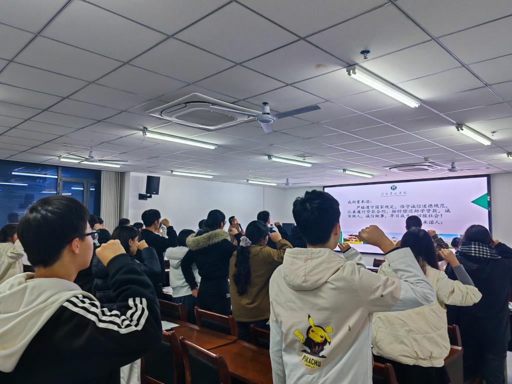 仪式尾声,谭翔升老师带领全体学生庄严宣誓,郑重承诺恪守诚信准则,严格履行合同约定,自觉做到按时还贷。本次签订仪式,不仅加深了学生对国家助学贷款政策的理解,也有效提升了学生的诚信意识和责任观念,为今后持续开展学生资助工作提供了有力支撑。(撰稿/信息工程学院 谭翔升)