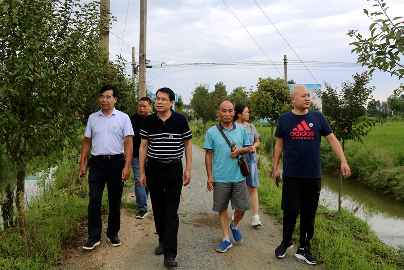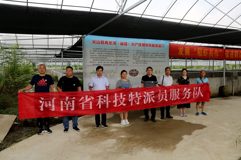 在光山县青龙河土地信用专业合作社,史洪中教授现场指导当前水稻病虫害绿色防控技术,对稻虾共作田稻纵卷叶螟危害提出用氯虫苯甲酰胺防控的具体措施。周本翔副教授现场指导小龙虾生境营造、饲料配比、适时捕捞等关键技术。其他专家也向合作社负责人李燕提出了发展当地特色产业,助推乡村振兴的意见建议。