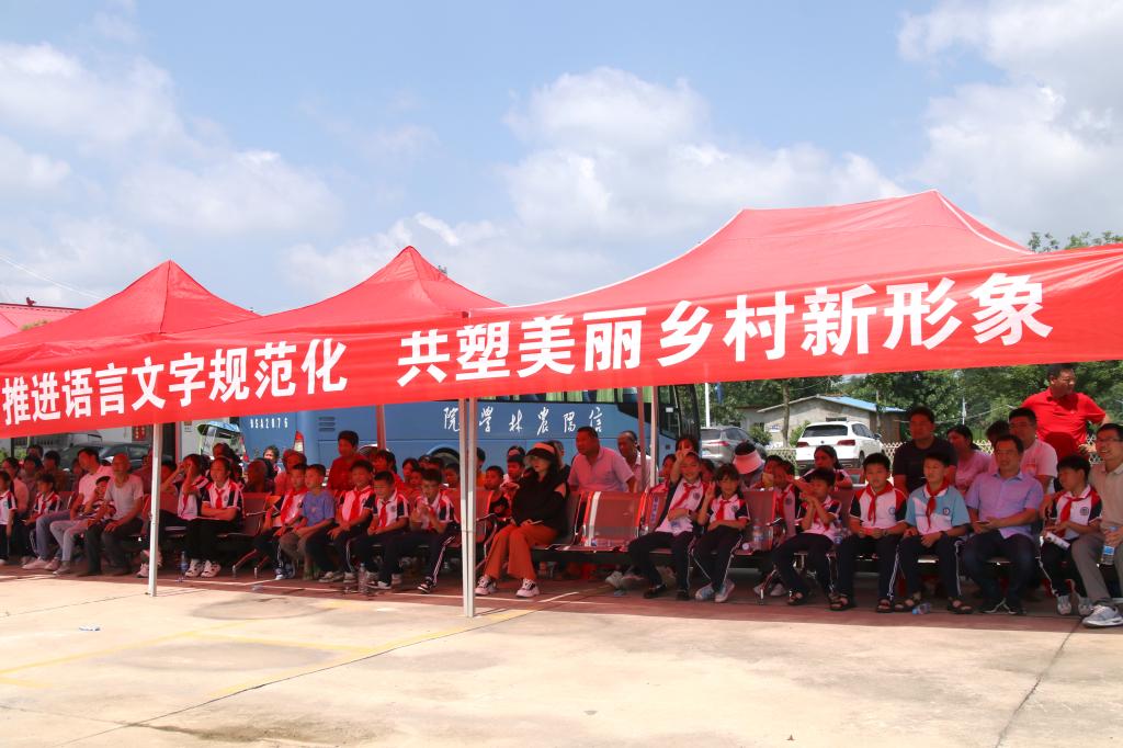 为做好此次活动,校语委办在前期进行了充分调研,选拔培养了一批优秀推普志愿者。来自融媒学院网络与新媒体专业师生经过精心准备,设置了“绕口令挑战”“乡规民约我来读”“二十四节气猜谜”三个环节,与现场一百余名村民、学生进行互动。在齐诵社会主义核心价值观、乡规民约等内容时,帮助村民树立规范发音意识,理解、认同准则规范,推动乡村民风、文化建设。“二十四节气猜谜”则充分联系村民生活实际,以反映节气的谚语为谜面,引导村民理解中华传统节气、节日的内涵。尽管天气炎热,但活动现场气氛热烈,大家在游戏中共同感受中国语言文字的魅力,感知推广国家通用语言文字的意义。