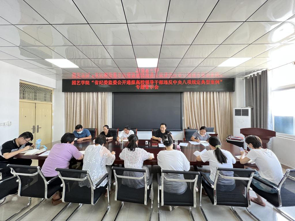 园艺学院党总支于2022年8月8日上午在实验楼2A322会议室组织学习《省纪委监委公开通报5起高校领导干部违反中央八项规定精神典型案例》,学院党总支书记张祖成同志主持会议,学院科级及以上干部、党支部书记参会。