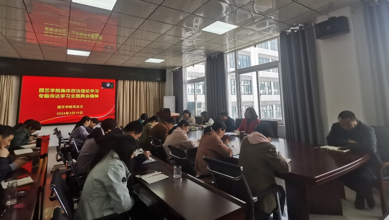 2024年3月19日下午,园艺学院党总支在实验楼2a322开展教职工政治理论学习,专题学习全国两会精神,全体教职工参会,集体学习由党总支书记杜丽主持。