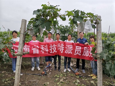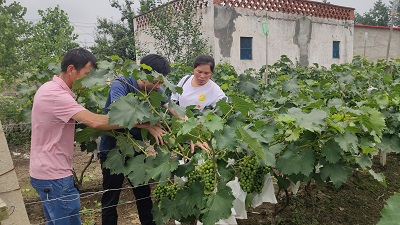 一行人来到当地葡萄种植户进行调研和指导,为种植户赠送《葡萄整形修剪技术》等种植资料。该种植户选择甬优1号葡萄品种,属欧美杂种。巨峰系第四代品种,四倍体。浙江省宁波市鄞州区王鹤鸣1995年在藤稔葡萄园发现一株叶片、果穗与藤稔不一样的芽变株,经测定可溶性固形物高达17%,果肉脆,味好,品质优于藤稔、巨峰。该品种在淮滨县种植适应性较为优良,但因前期淮滨县连阴雨天气的影响,葡萄霜霉病较为严重;疏花疏果技术不到位,导致葡萄果实过密,营养不充分,葡萄外观品质受到较大影响;因棚架设置较低,导致进行葡萄管理时操作不舒适,带来更多的劳动压力。李亮杰老师联系中国农科院郑州果树研究所全葡萄专家孙海生老师,与农户视频连线,对葡萄营养管理,采后修剪等问题进行远程指导。不仅为农户提供了更加实用的技术服务,并在农户和专家之家架起了桥梁,为葡萄种植园以后更好的发展提供有力支持。(园艺学院)