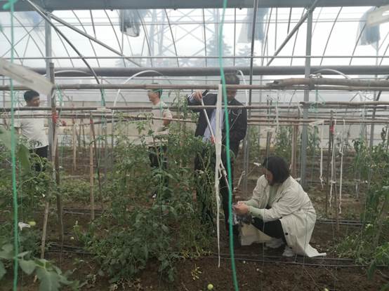 服务团成员首先在公司负责人陆松的陪同下对基地当前番茄设施栽培开展科技服务,指出在栽培过程中注意整地做畦,降低土壤湿度,以便整枝、打杈等田间管理和提前预防病害的发生;针对番茄青枯病较严重的大棚和未发病的大棚,分别取回土壤样品分析土壤理化性质及微生物多样性,为番茄青枯病科学精准防治提供依据。