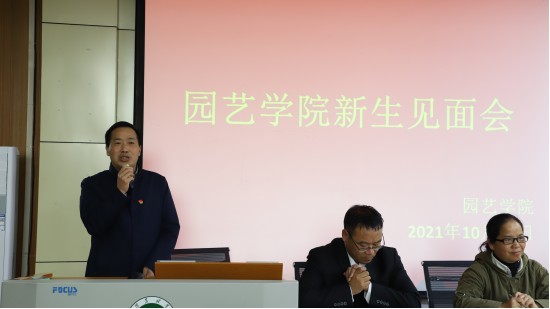 20211010日,园艺学院2021级新生见面会于2204如期举行。园艺学院党总支书记张祖成,院长龚守富副院长刘松虎何晖,设工教研室主任闵筱筱,2021级新生辅导员及全体新生参加。会议由党总支副书记陈丽文主持