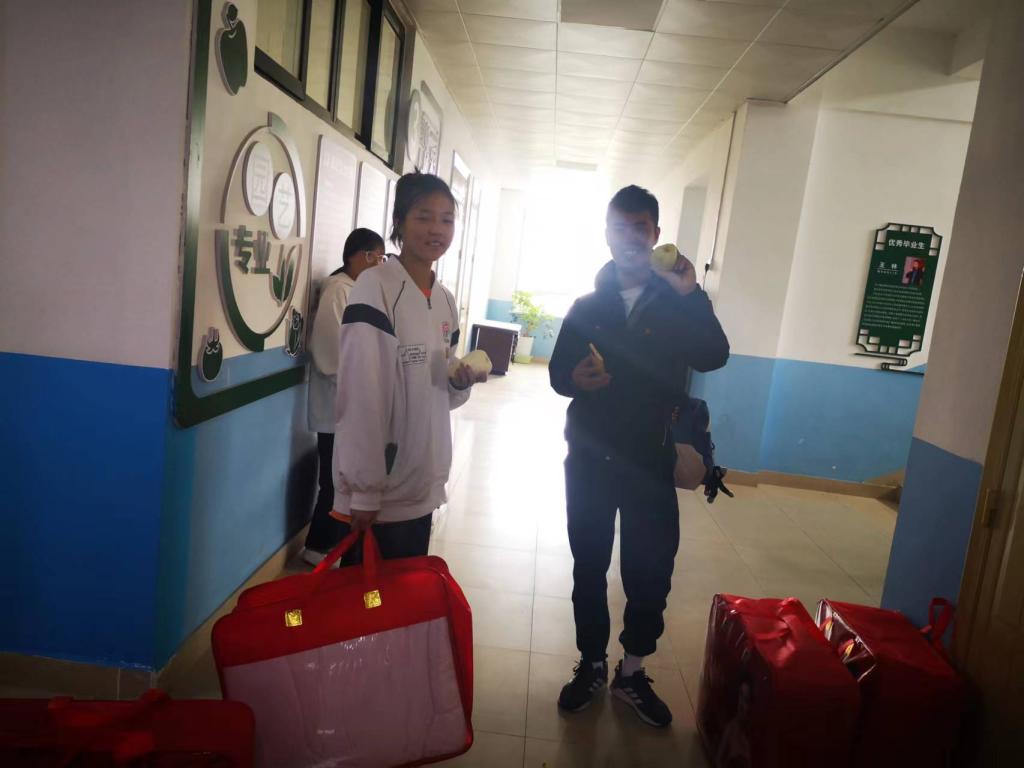随后,领导老师们为同学们发放了暖冬棉被。