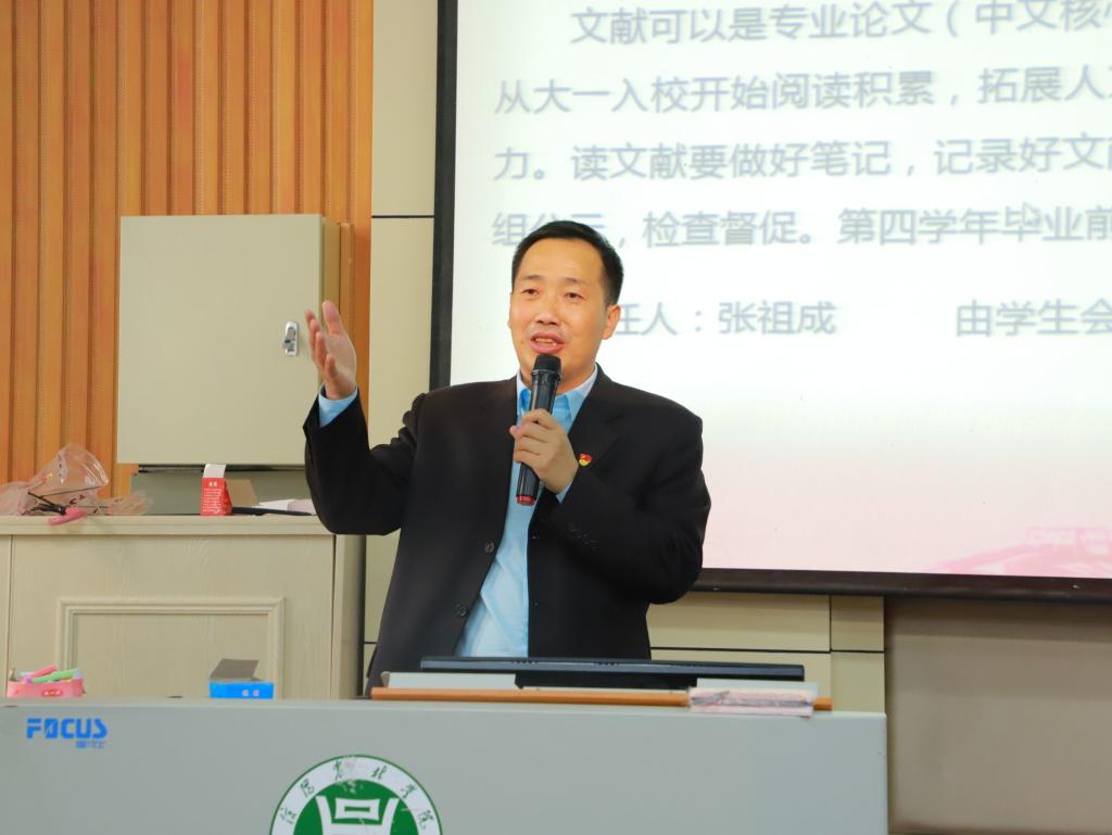 张祖成做总结讲话。他先用PPT辅助展示的方式从内容概要、开展情况、取得成效三个方面做了“五个一百工程”简介,接着提出了“五个一百工程”下一步工作思路与做法,最后向全体学生提出了三点要求:一是要坐稳“五个一百工程”列车,顺势而为,共同努力擦亮我院三全育人工作品牌;二是要充分利用碎片化时间,在“五个一百工程”点滴积累中持续丰富提升自己;三是要做好沟通,特别是做好老带新和不定期参加交流、竞赛及材料积累,达到共同提高的目的。