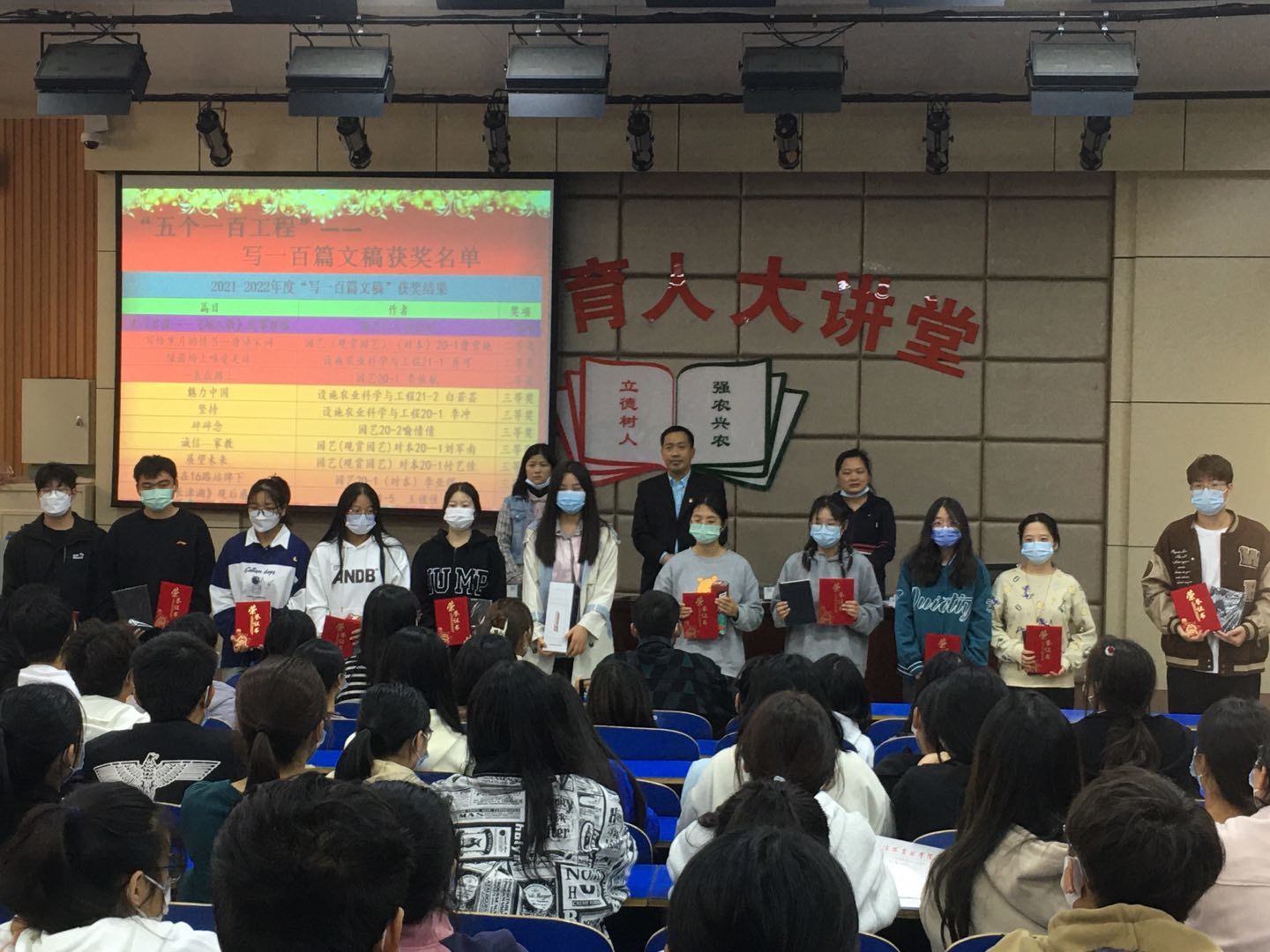 张祖成等现场抽查了“五个一百工程”记录本,陈娟娟宣读了“五个一百工程”2021-2022年度读文献分享大赛、写一百篇文稿大赛及识别植物大赛获奖名单,张祖成、陈丽文、陈娟娟为获奖学生颁奖,园艺20级孙飘然同学分享了参加“五个一百工程”项目的做法及收获,园艺20级齐家铭同学分享了参加“五个一百工程”项目中行一百次社会实践的体会,园艺21级杨占原分享了读一百篇文献的收获。