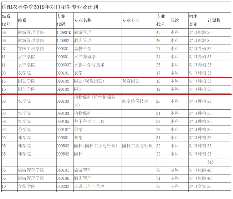 beat365在线平台官网园艺学院2019年对口本专科招生专业及计划表