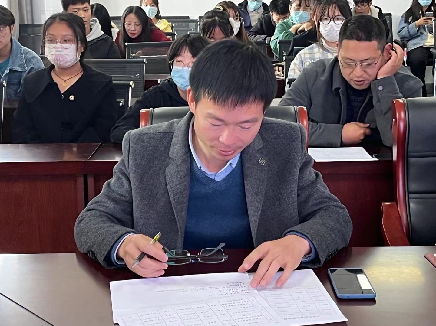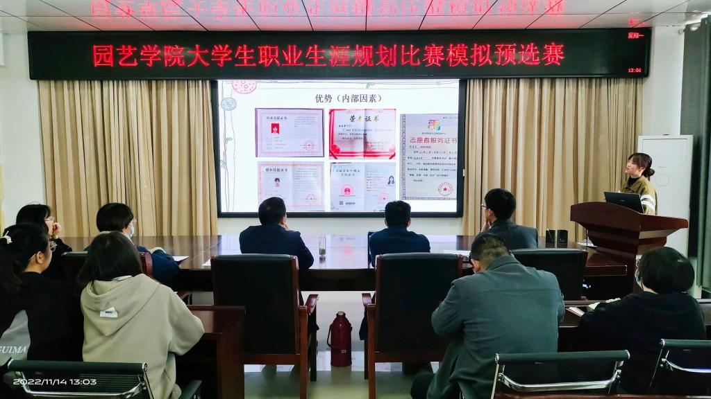 2022年11月14日中午12:30,园艺学院在2A322举办大学生职业生涯规划比赛模拟预选赛。党总支书记张祖成,就业专员缪百灵,朱赞彬,李亮杰,王亚坤,就业创业部成员参加此次活动。