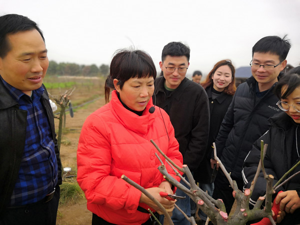 本次实训课内容为“梅花的花后修剪整形”。信阳市万年青园林工程有限公司胡迎春经理给师生们介绍了基地情况及梅花种类。汪老师讲解了梅花花后修剪的原理、原则、方法及其注意事项,强调梅花修剪要做到以下几方面:有形不死,无形不乱,因树修剪,随树作形;统筹兼顾,长远规划,均衡树势,从属分明,灵活掌握。本次修剪的梅花为幼树,在掌握以上原则的基础上,在修剪时还要掌握去弱留强、去直留斜、疏剪整形为主、正确促控、合理留芽、确保枝组健壮。全体学生分成10个小组,每个教师负责带领1-2个小组,每两个学生一把剪枝剪,并共同完成一棵梅花树的修剪整形,修剪后将大的创伤口涂抹伤口愈合剂。