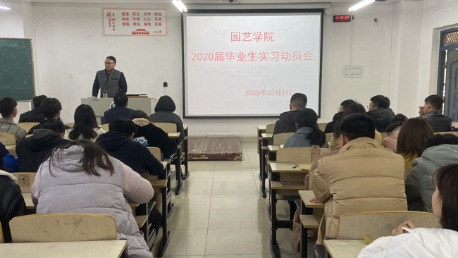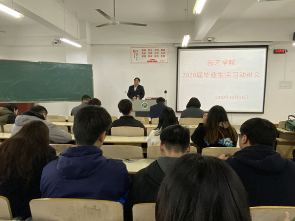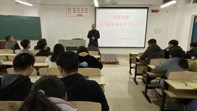 为确保2020届毕业生实习工作安全有序开展,增强学生实习期间的安全和责任意识,12月11日下午在2教207召开毕业生实习动员会。园艺学院党总支书记张祖成、院长龚守富、副书记陈丽文、副院长刘松虎,辅导员及部分专业教师参加了动员会。会议由副院长刘松虎主持。