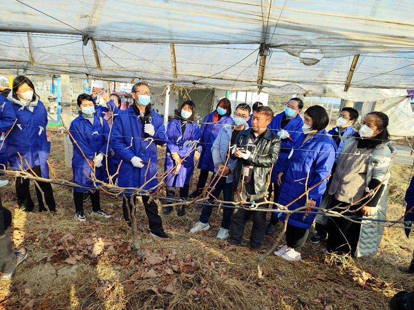然后,范宏伟在神龙山庄为大家示范‘阳光玫瑰’葡萄和梨树修剪方法,强调不同品种的果树,应根据其生物学特性、产量和品质合理的选择修剪时间和方法。教师们在范教授的指导下积极的对葡萄和梨树进行修剪。