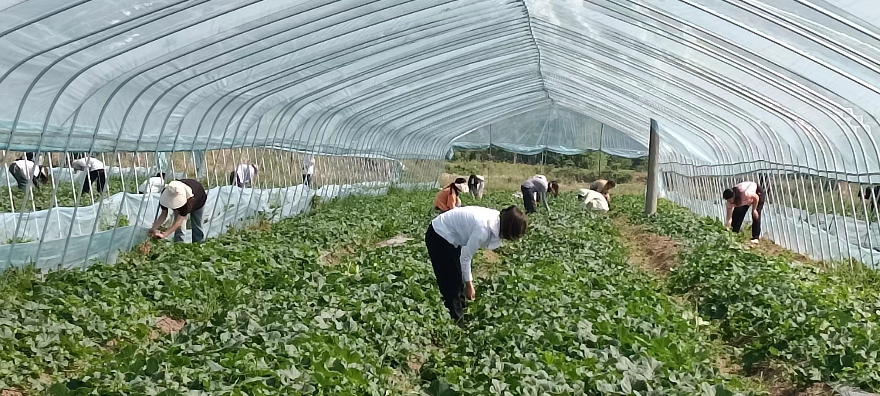 学生在俊农发展农业专业合作社大棚进行冬瓜植株调整