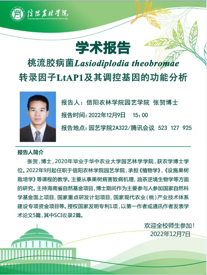 园艺学院博雅讲堂:桃流胶病菌Lasiodiplodia theobromae转录因子LtAP1及其调控基因的功能分析