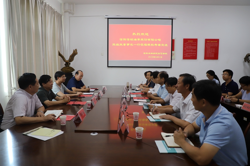 9月4日下午,全国人大代表、信阳信锐油茶股份有限公司董事长熊维政、市工信局原局长张春茗、市人社局原副局长陈廷森、新县林茶局原局长党智华等一行到我院考察交流。