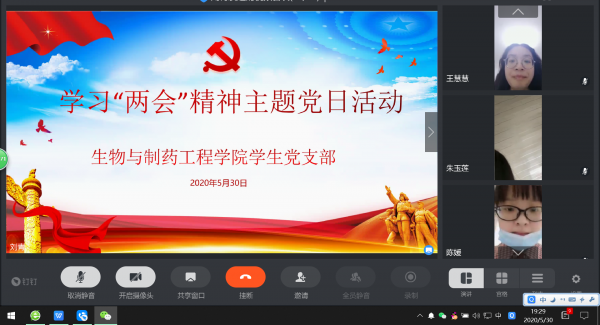 生物与制药工程学院学生党支部全体党员为深入学习贯彻全国两会精神,于2020年5月30日,在钉钉平台开展了学习两会精神主题党日活动,会议由学生党支部书记刘青主持,学院全体党员参加。