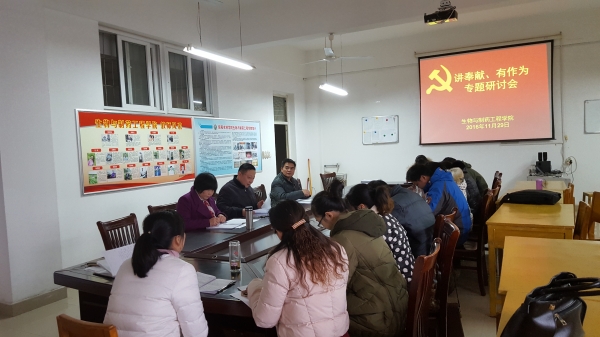 11月29日下午,根据学校“两学一做”学习教育整体安排部署,生物与制药工程学院党总支在2C527会议室召开了“两学一做”学习教育“讲奉献、有作为”第四专题研讨会。院全体党员教师参会,会议由院党总支书记茹永强主持。