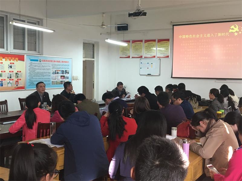 茹书记从介绍新一届中央领导班子入手,生动形象地向大家介绍了十九大主要会议内容,全面阐述了习近平总书记提出的“新时代中国特色社会主义思想”,茹书记强调:“我们大家一定要清晰地认识到现阶段社会主要矛盾是人民日益增长的美好生活需求和不平衡不充分的发展之间的矛盾。”茹书记指出:“党的十九大是在全面建成小康社会决胜阶段的一次关键的大会,是在新的历史起点上开启党和国家事业新征程十分重要的一次大会。各位老师和学生要深刻理解党的十九大会议精神实质,切实把思想和行动统一到党中央的决策上来,为实现中华民族伟大复兴中国梦不懈奋斗。”茹书记要求:“全院领导干部要认真学习和贯彻落实十九大精神,尤其是要把十九大有关教育教学、人才培养、创新创业方面的政策梳理出来,结合工作实际,进一步加强学习,做好规划,为下一步全面贯彻落实十九大精神做好充分准备。”