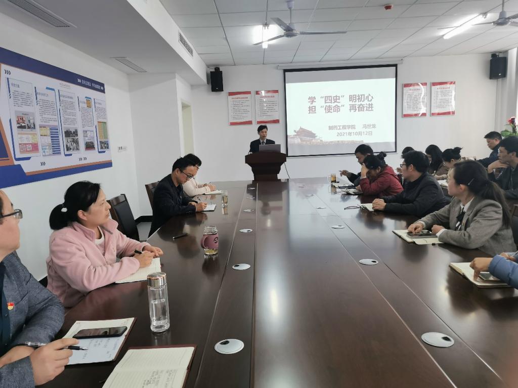 为深入学习贯彻落实习近平总书记关于党史、新中国史、改革开放史、社会主义发展史学习的重要讲话和指示精神,扎实推进“四史”宣传教育,按照学校党史学习教育总体部署和学院党史学习教育安排,10月12日,制药工程学院党总支在E315举办“四史”学习专题宣讲报告会,学院党总支书记冯世龙作专题宣讲报告。党总支副书记李娜主持会议,学院全体教职工和部分学生代表参加。