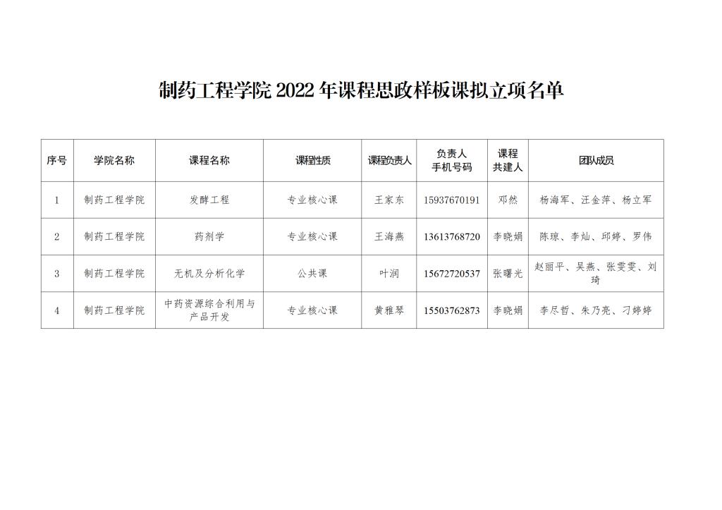 制药工程学院2022年课程思政样板课拟立项名单
