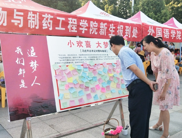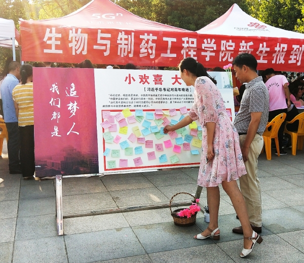 段鸿斌院长介绍“小欢喜,大梦想”主题背后蕴含着学院全体老师对新生们美好祝福,随后由李娜老师宣布此次活动正式开始。在活动进行过程中,迎新学生队伍热情地邀请已经报到好的新生们在便签上写上自己的到校心情和对未来的规划,并张贴到活动展板上。新生们写在便签上的文字刚健有力,看得出来他们对自己的大学生活充满期待和信心。最后,李娜老师对此次活动做出总结,她对迎新学生队伍工作予以肯定,并祝愿19级新生们都能过好大学生活、成就伟大梦想。