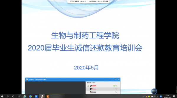 5月16日中午,生物与制药工程学院召开了2020届毕业生诚信还款网络教育,会议由我院资助专员陈颐辉老师主持,我院毕业班申请有助学贷款的学生参加了此次会议。