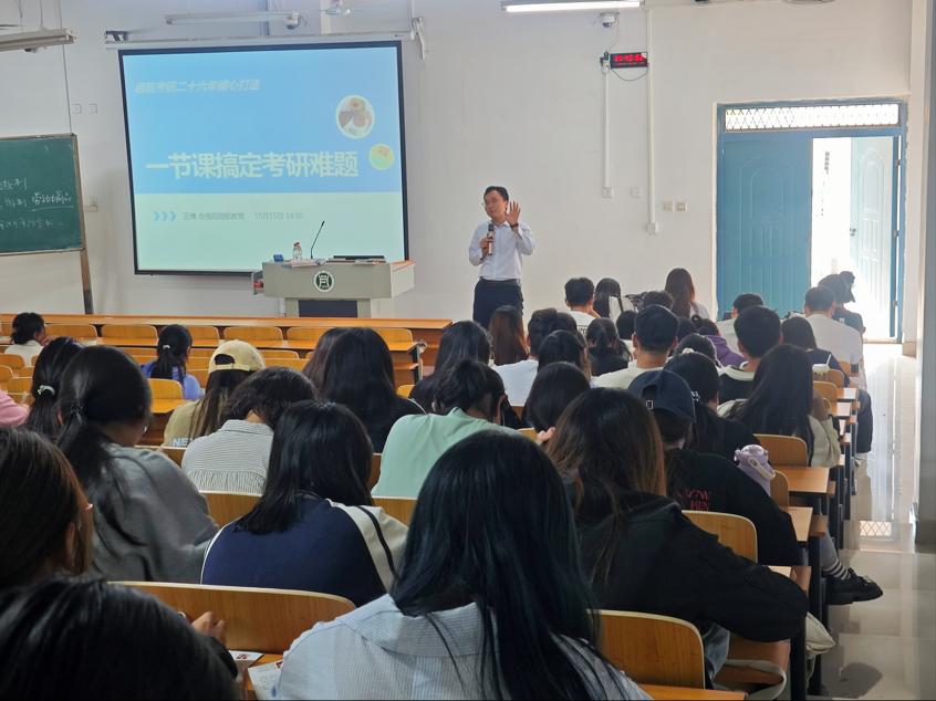为了帮助我院学生更好地明确考研目标,科学备考,面向大三学生开展考研引导教育,提供全方位的支持和保障。药学院于10月15日在二教304举办2026届考研全程规划指导讲座。本次指导会邀请启航考试培训学校王博主讲,药学院2026届部分学生参加。