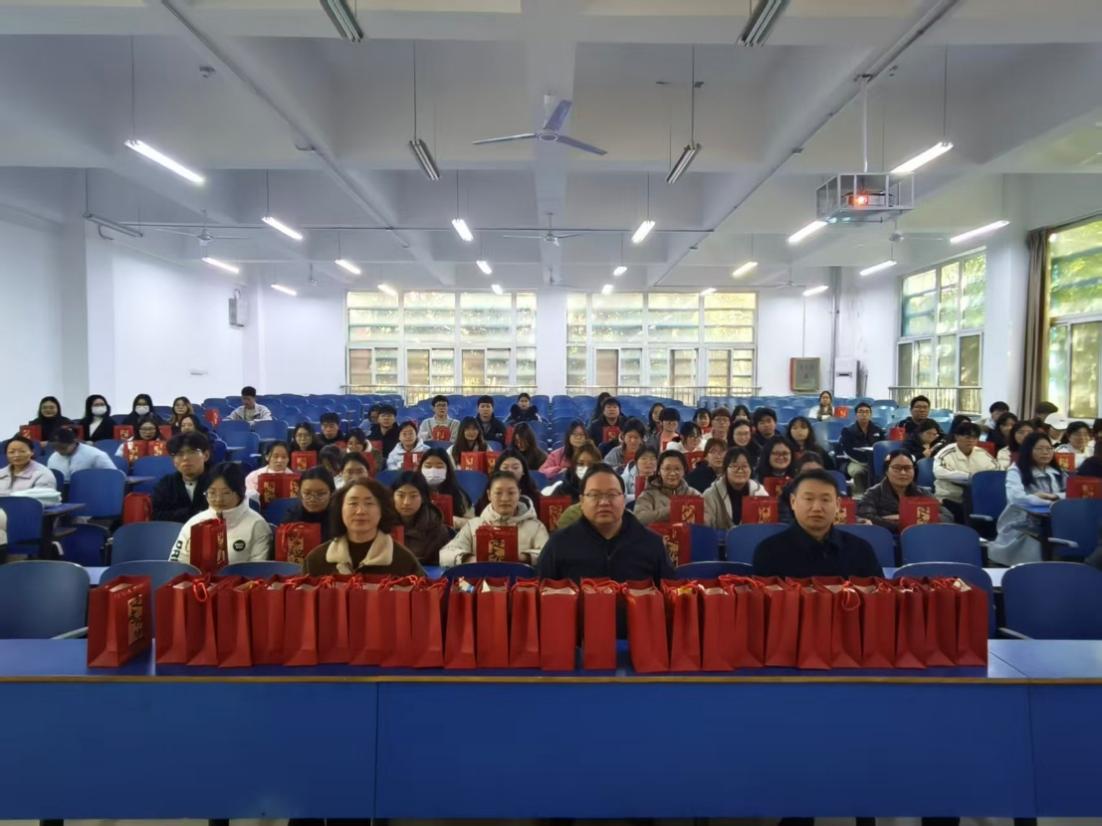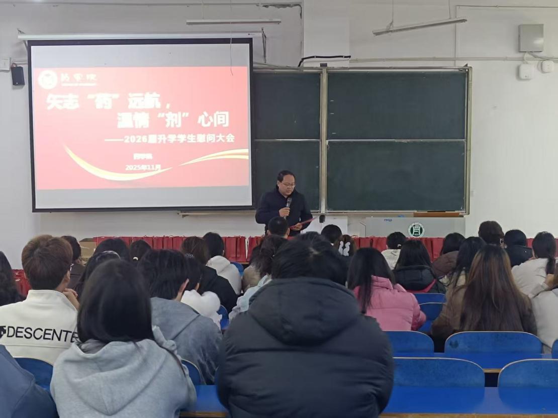11月18日,药学院在一教E102举办了以“矢志‘药’远航,温情‘剂’心间”为主题的2026届升学学生慰问大会。药学院院长王家东、党委副书记朱舒翼、副院长张艳玲及各毕业班辅导员出席此次大会。