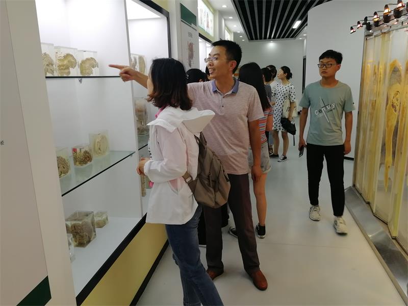 本次实践教学主要采取实地观摩、现场讲解、启发式引导及自由提问等模式,将课堂理论教学与实践教学紧密结合,让学生直观了解人体各系统、脏器的位置和具体功能。叶兆伟和刘敏杰两位教师着重向学生讲述人体主要系统和脏器与常见疾病之间的关系,一方面吸引学生的学习兴趣,激发学生学习的主动性,另一方面为学生后续对《药理学》、《药物制剂学》等课程的学习奠定基础。同学们被标本室内逼真的标本和生动形象的教学辅助装置深深的吸引着,大家对人体主要结构和功能有了更加深入的认识。