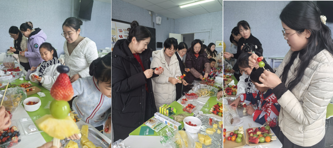 活动现场布置得温馨又喜庆,浓厚的节日氛围扑面而来。新鲜饱满的山楂、草莓、葡萄、圣女果等水果整齐摆放,冰糖、竹签、熬糖锅具等制作材料与工具一应俱全,静待老师们巧手创作。